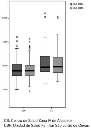 Resultados: En 2014 se estudiaron 200 pacientes portugueses y 278 españoles. Dos años después, se disponía de información en sus historias clínicas para 135 portugueses y 248 españoles. La media de edad de estos pacientes en 2016 era de 71,2 años (DE: 11,0), con 46,0 % de mujeres. No había diferencias en la distribución por edad y sexo entre ambos centros. La mediana de variación en la HbA1c a los 2 años era 0,0 (rango intercuartil:-0,4 a 0,5), sin diferencias estadísticamente significativas en los portugueses y un moderado aumento (p=0,05) para los españoles. Los portugueses presentaban una disminución media del IMC de 0,05 (IC95 %:-0,27 a 0,37) y los españoles tenían un aumento medio de 0,07 (IC95 %:-0,27 a 0,41), sin existir diferencias estadísticamente significativas.