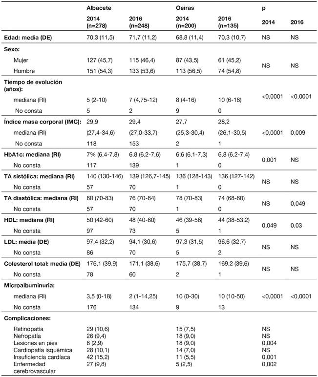 Main measurements: The data obtained from the computerized clinical records were sex, age, years of disease course, body mass index (BMI), microalbuminuria, glycosylated hemoglobin (HbA1c), lipid profile, complications, and treatment. The information was entered into a computerized database with the statistical program SPSS 17.0. Descriptive statistics and comparison of proportions and means/medians were performed.