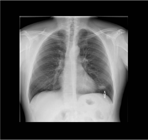 Varón de 46 años sin antecedentes personales de interés. Padre fallecido de cardiopatía isquémica aguda a temprana edad. Refiere que, estando jugando en la playa, notó un fuerte dolor en la pantorrilla izquierda. Hizo reposo relativo con vendaje elástico sin apoyar la pierna. Tomó antiinflamatorios para el dolor. A los 4-5 días comenzó con dolor intenso en el costado izquierdo irradiado al hombro que empeoraba con los movimientos. Mejoró con masajes en su lugar de vacaciones. Tras regresar a su domicilio acudió a nuestra consulta por persistencia del dolor en la pierna izquierda, al que se ha añadido inflamación y tumefacción en las últimas horas. No refería fiebre, pérdida de peso ni otros síntomas generales. Tanto la presión arterial como la auscultación cardiorrespiratoria fueron normales. La pierna izquierda presentaba tumefacción y dolor en la pantorrilla y el muslo; se palpaban varias adenopatías en región inguinal de forma bilateral, de aproximadamente de 1 cm la mayor de ellas. Solicitamos una radiografía de tórax (Figura 1) que mostró una condensación oval sugestiva de infarto pulmonar. Ante este hallazgo derivamos al paciente a urgencias hospitalarias donde, tras constatar elevación del dímero D (resto de la analítica normal), se realizó un eco-doppler objetivándose una extensa trombosis venosa profunda que afectaba a venas gemelares, poplítea y vena femoral superficial izquierda (Figura 2), así como múltiples adenopatías inguinales y poplíteas. El TAC toraco-abdominal confirmó la imagen sospechosa de tromboembolismo pulmonar y puso de manifiesto múltiples adenopatías abdominales y en el área mediastínica. Fue tratado con heparina de bajo peso molecular a dosis terapéuticas y priorizaron nuestra solicitud de punción guiada por ecografía de una de las adenopatías, ante la sospecha de un síndrome paraneoplásico. El resultado de la citología fue positivo para células tumorales malignas: linfoma no Hodgkin B de células del manto.
