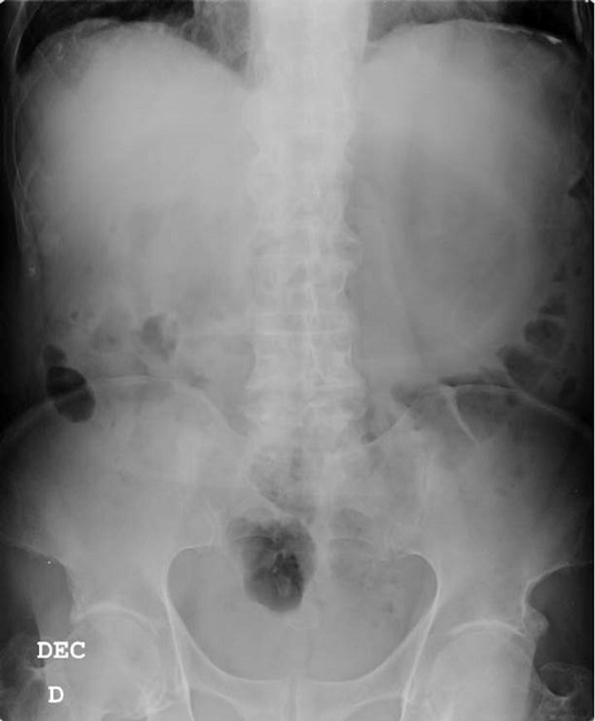 Se trata de un varón de 83 años que acude a urgencias por vómitos de contenido alimenticio desde hace horas y dolor abdominal generalizado, tipo cólico, que mejoraba con el vómito. Además, ausencia de ventoseo desde hace 24 horas. Niega diarrea ni alteraciones genitourinarias. Afebril.