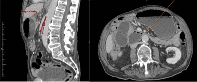 En la radiografía abdominal (Figura 1) se objetivó una gran dilatación en el epigastrio (estomacal vs colónica). Ante dicho hallazgo se plantearon como posibles diagnósticos una obstrucción abdominal por bridas (se evidenciaron múltiples adherencias por colecistectomía previa), íleo paralítico secundario a pancreatitis aguda o un pinzamiento aortomesentérico. Se decidió solicitar una tomografía computerizada (TC) abdominal (Figuras 2 y 3) que evidenció una diverticulosis colosigmoidea sin dilatación de marco cólico y asas de intestino delgado no dilatadas, además de una significativa dilatación de la cámara gástrica así como de las dos primeras porciones duodenales, coincidiendo la existencia de un cambio de calibre con la transición entre la arteria aorta y la arteria mesentérica superior. En el plano sagital estas estructuras formaban un ángulo de 9°. Estos hallazgos eran compatibles con un pinzamiento aortomesentérico (síndrome arteria mesentérica superior).