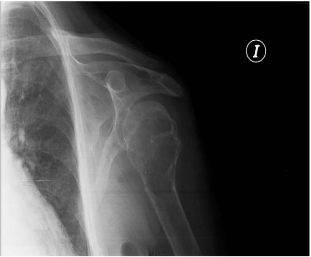 Presentamos el caso de una mujer de 87 años, con antecedentes de hipertensión arterial en tratamiento con un inhibidor de la enzima convertidora de angiotensina, que acude a la consulta de su médico de familia por dolor e impotencia funcional de aparición brusca en el hombro izquierdo de 5 días de evolución. Niega traumatismo previo, aunque relaciona la aparición de la clínica con la realización de gimnasia en el centro de día al que acude 2 veces por semana. Durante la anamnesis también refiere estreñimiento desde hace 8-9 meses junto con hiporexia y pérdida de peso no cuantificada, no habiendo consultado por este motivo con anterioridad. A la exploración presenta dolor a la palpación del húmero proximal e imposibilidad para mover de forma activa el brazo izquierdo, por lo que se solicita una radiografía de hombro urgente en la que se aprecia distorsión de la arquitectura ósea junto con lesiones quísticas y un defecto en la cortical compatible con fractura aguda (Figura 1). Revisando estudios analíticos previos encontramos una hipercalcemia leve sostenida en los últimos 5 años. Ante el hallazgo de una fractura patológica en el contexto del síndrome constitucional acompañante y junto con la hipercalcemia de larga evolución decidimos remitirla para estudio a la consulta de Medicina Interna, planteando como posibles diagnósticos el HPP versus el origen tumoral. El estudio analítico mostró cifras bajas de fósforo y vitamina D y altas de calcio, fosfatasa alcalina y PTH, esta última veinte veces por encima del límite superior, lo que apoyó el diagnóstico de HPP. La paciente ingresó para completar estudio, realizándose una ecografía de cuello que reveló un nódulo en el lóbulo tiroideo derecho compatible con un adenoma paratiroideo, pero rechazó el tratamiento quirúrgico (la paratiroidectomía), iniciándose así tratamiento farmacológico durante el ingreso con una dosis única intravenosa de ácido zoledrónico 4 mg y posteriormente con cinacalcet en dosis ascendente hasta 120 mg/día por vía oral, presentando a día de hoy y tras 3 años de tratamiento una buena evolución tanto clínica como analítica, con niveles de calcio dentro de la normalidad y mejoría de la densitometría ósea, sin aparición de nuevas fracturas patológicas.