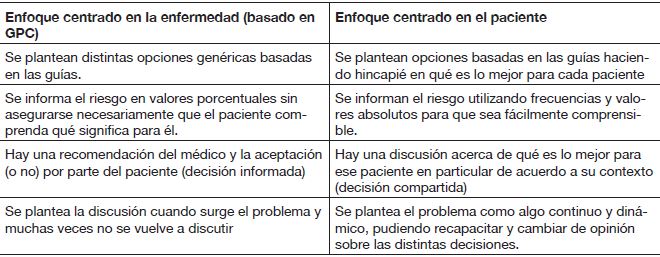 A primera vista, pareciera que las GPC, utilizando la Medicina Basada en la Evidencia (MBE)8, ya incorporan un modelo centrado en el paciente, por lo que hablar de TDC podría sonar redundante o innecesario. Sin embargo, la MBE, que toma como regla de oro a los ensayos clínicos, se focaliza principalmente en la enfermedad, utilizando la estadística poblacional de un grupo de personas que comparte la misma condición clínica9. Esto se refleja en el diseño de las GPC, que no suelen incorporar la influencia del contexto socio-personal de los pacientes10. La TDC se propone unir estos dos paradigmas, tomando la valiosa información que brinda la evidencia científica y combinándola con los valores y preferencias de cada paciente individual. Está demostrado que los profesionales de la salud no involucran lo suficiente a los pacientes en la toma de decisiones (aunque creen que sí)11) y éstos a su vez quieren recibir más información y adoptar un rol más activo al decidir sobre sus problemas de salud12. Esto podría deberse, en parte, a que el concepto de TDC no queda del todo claro13) o se interpreta como sinónimo del consentimiento informado12.