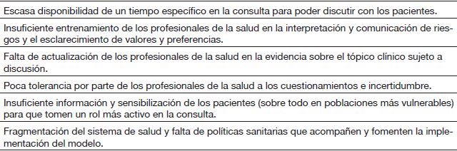 El bajo grado de alfabetización en salud de la población es otra de las barreras22,23. Por un lado, la información que se presenta suele ser más difícil de entender para los pacientes24. Por otro lado, esto también parecería impactar sobre las preferencias a la hora de involucrarse en la toma de decisiones, siendo las personas con mayor nivel de alfabetización en salud las más interesadas en un modelo colaborativo y centrado en el paciente25. Esto resalta la importancia de reforzar las intervenciones para implementar la TDC en poblaciones más vulnerables.