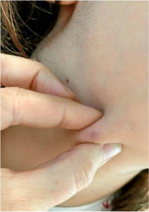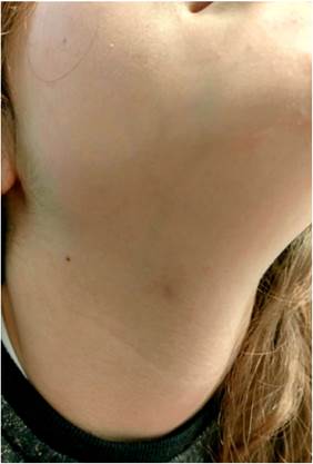 Presentamos una paciente de 10 años de edad con un quiste indurado, profundo, en la región anterior del cuello desde hace 1 mes (Figuras 1 y 2). Era un nódulo asintomático, suave, azulado de 3x4 mm. Previamente la paciente había presentado seis lesiones similares diagnosticadas de pilomatrixomas, distribuidas una en la cabeza, una en la espalda (Figura 2), una en el miembro superior derecho, una en el miembro superior izquierdo y una en cada uno de los miembros inferiores, que le fueron extirpadas y diagnosticadas por Anatomía Patológica.