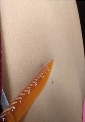 El diagnóstico es fundamentalmente clínico; además de comparar con las lesiones anteriores, realizamos un examen físico de la lesión. Se palpa una lesión profunda, de consistencia pétrea y móvil, cubierta por piel. A la presión podemos observar el signo de la “tienda de campaña”, que consiste en el pliegue de la piel formando ángulos y facetas (Figura 3)1.