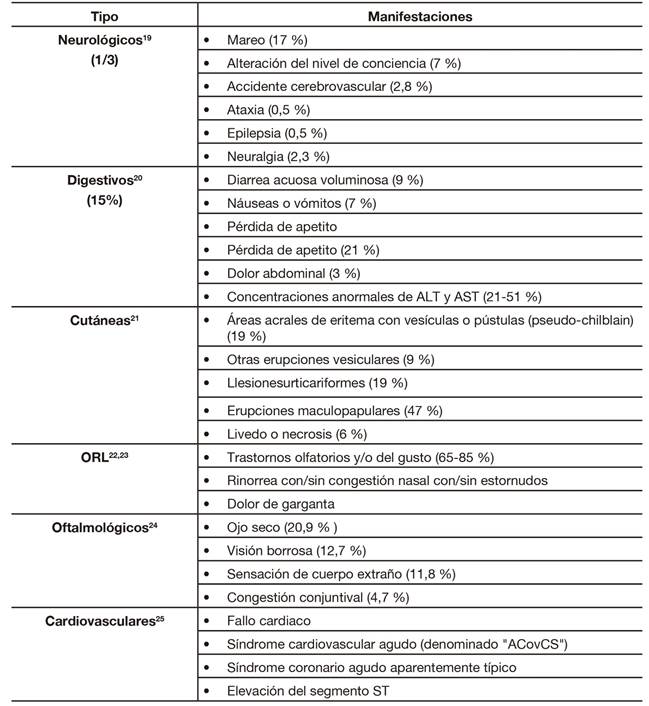 Con la evolución de la pandemia se han descritos síntomas diferentes de los respiratorios clásicos o habituales17-25 (Tabla 1). La frecuencia de estos síntomas, denominados atípicos, es inferior los síntomas respiratorios característicos (tos, disnea)17. Cronológicamente suelen aparecer tras el inicio de los síntomas respiratorios. En ocasiones pueden ser presentaciones iniciales o incluso manifestaciones únicas de la infección por COVID-1917-18. Las disfunciones olfativas y gustativas se presentan de forma precoz en una 12 % de los casos e incluso como síntoma único en un 3 % de los casos22,26. La pérdida repentina del olfato sin obstrucción nasal presenta un alto valor predictivo de COVID27. Aproximadamente el 10 % de los pacientes con COVID-19 podrían presentarse solo con síntomas gastrointestinales, sin síntomas respiratorios20. En la actualidad, con excepción de los trastornos del olfato y/o el gusto, estos síntomas atípicos no constituyen un criterio reconocido de sospecha clínica, ni de indicación de pruebas microbiológicas. No obstante, su detección puede facilitar el diagnóstico más temprano, así como aumentar la vigilancia de la transmisión viral y recomendar medidas preventivas que eviten la posible transmisión hasta conocer los resultados de las pruebas microbiologicas17,18.