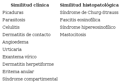 El diagnóstico se realiza dentro de un contexto clínico de sospecha de lesiones compatibles, en ocasiones asociado a un cuadro general de fiebre, artralgias y malestar inespecifico7, y con una biopsia de la lesión que mostrará infiltrados eosinofílicos difusos y “figuras en llama”2 que, sin ser suficiente por sí sola para el diagnóstico, al acompañarse de forma concomitante de manifestaciones clínicas características11, permitirá el diagnóstico. El principal dato analítico que nos ayuda al diagnóstico es la eosinofilia periférica, aunque solo se encuentra aumentada en el 50 % de los pacientes; por tanto, no es imprescindible para el mismo7. Debemos destacar la importancia que tiene para el médico de familia realizar un adecuado diagnóstico diferencial que incluya principalmente procesos infecciosos, oncohematológicos y entidades en las que el eosinófilo es una célula clave (Tabla 1).