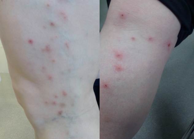 Mujer de 38 años, con antecedentes personales de diabetes mellitus tipo 2 y obesidad mórbida, que presenta desde hace tres meses lesiones pápulo-nodulares eritematosas y pruriginosas localizadas en el tronco y las extremidades, incluyendo manos y pies. Su aparición es recurrente, curando algunas y apareciendo nuevas (Figura 1a-1b). No presentaba clínica sistémica, salvo febrícula ocasional al agravarse el cuadro. La paciente recuerda que ella y su madre presentaron picaduras al inicio del cuadro. La exploración física muestra lesiones pápulo-nodulares en diferentes estadios, algunas en fase de resolución junto con nuevas lesiones.