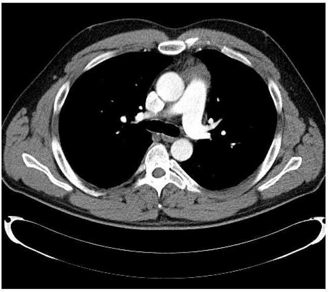 Entre las pruebas complementarias realizadas, la analítica sanguínea y serológica son negativas y con datos en rango de normalidad. En la resonancia magnética sin contraste y tras la administración del mismo no se aprecian hallazgos significativos. Sin embargo, en la tomografía axial computarizada torácica se observa una imagen sugerente de timoma en el espacio prevascular de 3 cm, de contorno bien definido y densidad heterogénea; la masa contacta con la pleura mediastínica izquierda y con el pericardio, sin claros signos de infiltración. No se aprecian adenopatías mediastínicas ni hiliares de tamaño significativo (figura 1).