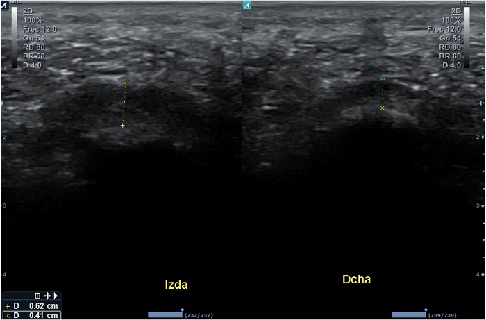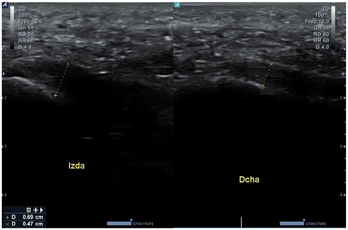 Tras realizar una exploración física, se completó el estudio mediante una ecografía y se le diagnosticó fascitis plantar. Comprobamos, en un corte longitudinal, el aumento de grosor de la fascia de 6,9 mm y una ecotextura relativamente hipoecogénica (figura 1), lo que permitió confirmar el diagnóstico. En el corte transversal también se pudo observar dicho aumento de grosor, de 6,2 mm (figura 2). Se realizó una infiltración de corticoides eco-guiada con la que el paciente obtuvo mejoría.