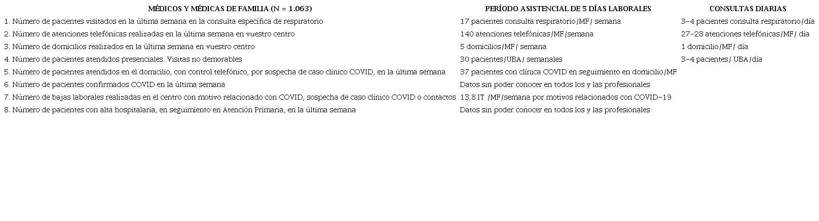En todos los centros de salud se establecieron circuitos de acceso y constituyeron espacios protegidos, consultas específicas para la atención a los pacientes con clínica respiratoria sugestiva de la COVID-19. Según los datos de la encuesta, la actividad en estas consultas presenciales de respiratorio era elevada, con una media de tres y cuatro pacientes presenciales diarios por MF. A ellas se sumaban tres-cuatro pacientes que correspondían a consultas no demorables porque precisasen cuidados o atención urgente (63,5%). Sin embargo, la mayoría de las demandas eran atendidas de forma telemática. Especialmente, a través del teléfono, alcanzando una alta actividad asistencial (27-28 atenciones/MF/día). Los datos reflejan que en ese momento la actividad asistencial del conjunto de MF estaba centrada en la COVID-19, con atención específica en las consultas diseñadas para ello, con una media de 17 pacientes/MF/semana.