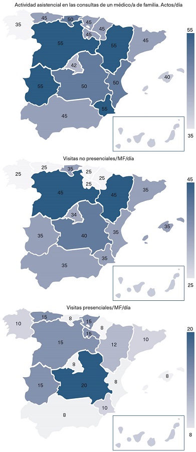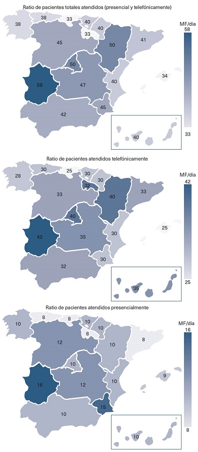 A la luz de los datos de la encuesta, la actividad asistencial durante el período estival se mantuvo con unas ratios de actividad asistencial muy elevadas, con una media de 43 consultas/MF/día en la mayoría de las CCAA que se distribuían en 32,5 por atenciones telemáticas MF/día, y 10 visitas presenciales/MF/día (tabla 2).