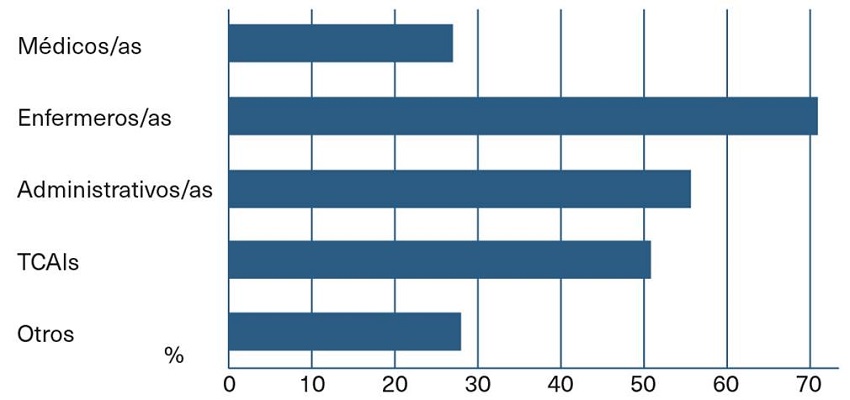 Objetivamos que aproximadamente en el 70% del entorno de Atención Primaria se produjo un leve aumento de las plantillas, especialmente de profesionales de enfermería (72%), técnicos auxiliares de enfermería (52%) y personal administrativo (57%). El incremento fue muy inferior, del 23% en el caso de MF, a pesar de la elevada presión asistencial (figura 3).