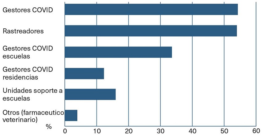En el contexto de salud pública, la figura del rastreador de contactos, tan necesaria para colaborar en el control de los entornos de la COVID-19, no se implantó con la agilidad y facilidad que la situación requería. En el mes de julio de 2020, a pesar de las recomendaciones por parte de la OMS y de las autoridades en Salud Pública, aún no se disponía de esta figura en gran parte de los equipos de Atención Primaria. Las CCAA y las diferentes administraciones incorporaron esta figura en el ámbito asistencial de forma heterogénea y dispar. Así, según los datos de la encuesta, en julio de 2020 nos encontrábamos con que el 36% de los equipos de Atención Primaria de nuestro país (uno de cada tres) seguía sin disponer de equipos de rastreadores, por lo que estas tareas se incorporaron a los equipos con la consiguiente sobrecarga asistencial. En aquellos entornos en los que se incorporó la figura del rastreador, se integró en los equipos de Atención Primaria (32%) y en otros formaba parte de equipos externos (32%).