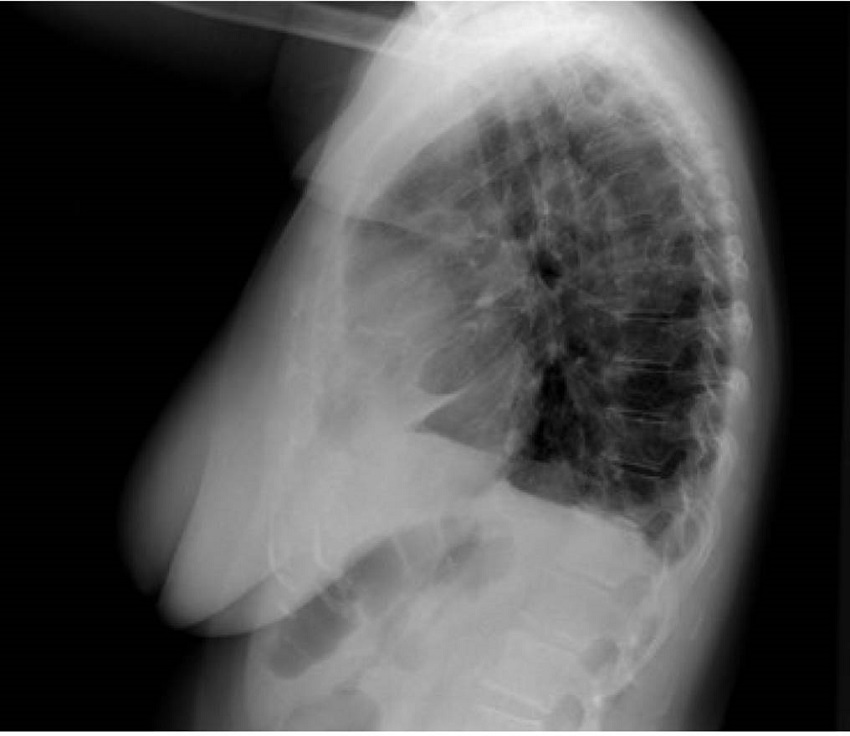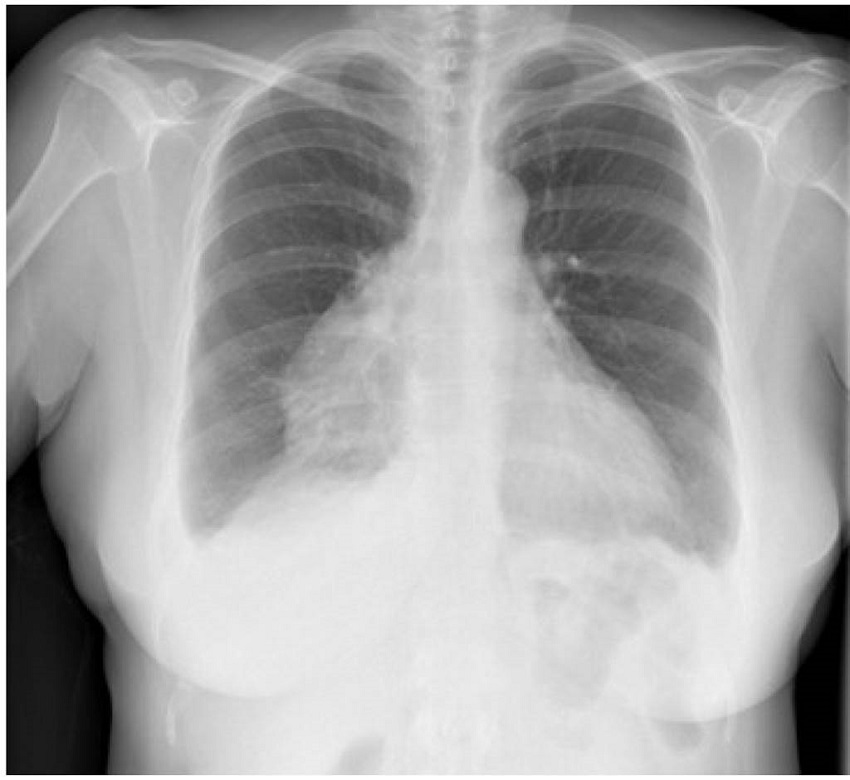 En urgencias hospitalarias, el estudio se completó con una prueba de laboratorio, en la que se objetivó un aumento de los reactantes de fase aguda (proteína C reactiva 118,7 mg/L y fibrinógeno 692 mg/ dL), sin aparición de otros hallazgos sugestivos de infección ni elevación de marcadores de daño miocárdico o indicadores de insuficiencia cardíaca. También se le hizo una radiografía de tórax, en la que se apreció una imagen compatible con cardiomegalia versus masa mediastínica anterior, con una pérdida de volumen en lóbulo inferior derecho y derrame pleural bilateral (figuras 1 y 2).