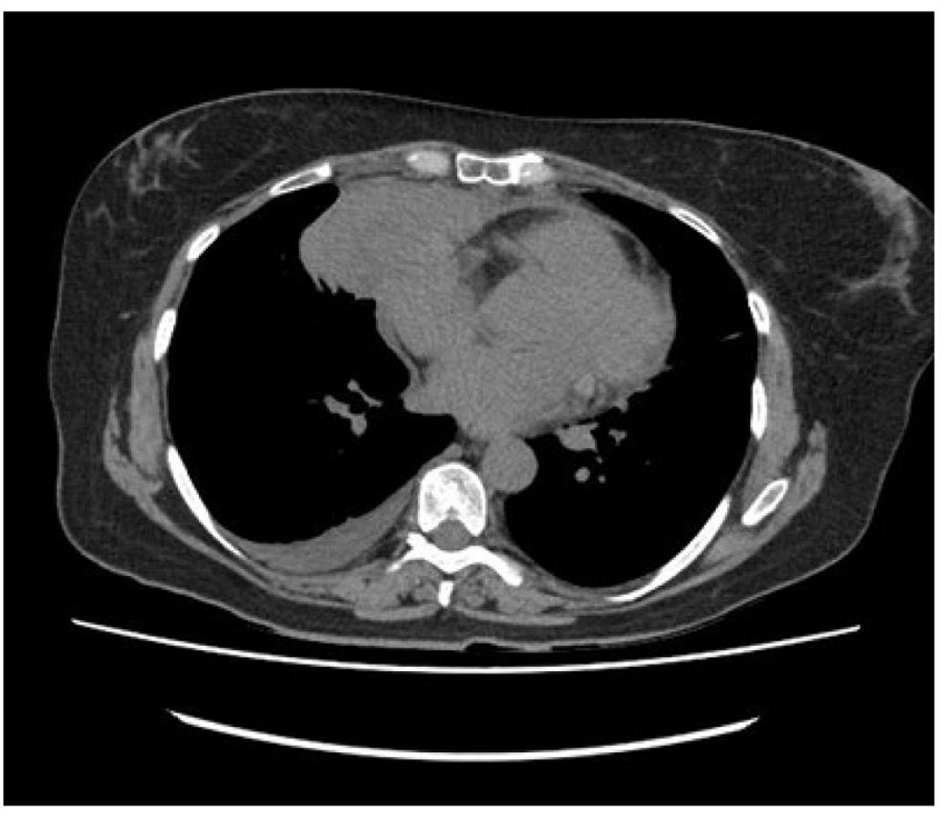 La paciente acudió a consulta de forma urgente por presentar un dolor torácico de 24 horas de evolución, localizado en hemitórax derecho, características opresivas, reflejado a nivel cervical, acentuado con los movimientos respiratorios. Se asoció a febrícula de 37,3 ºC, marcado decaimiento e inapetencia, junto con ocasionales náuseas. En la exploración física destacó importante ansiedad, asociando taquipnea (48 rpm) y discreto trabajo respiratorio. Las constantes vitales fueron normales, salvo la saturación de oxígeno, que fue del 95%. La auscultación cardiopulmonar no reveló signos patológicos. Se realizó como prueba complementaria un electrocardiograma que tampoco mostró anomalías, por lo que, siguiendo el protocolo de actuación de nuestra comunidad, dado que la paciente presentaba clínica compatible con infección por SARS-Cov-2 y signos de dificultad respiratoria, se derivó a urgencias hospitalarias mediante transporte sanitario.