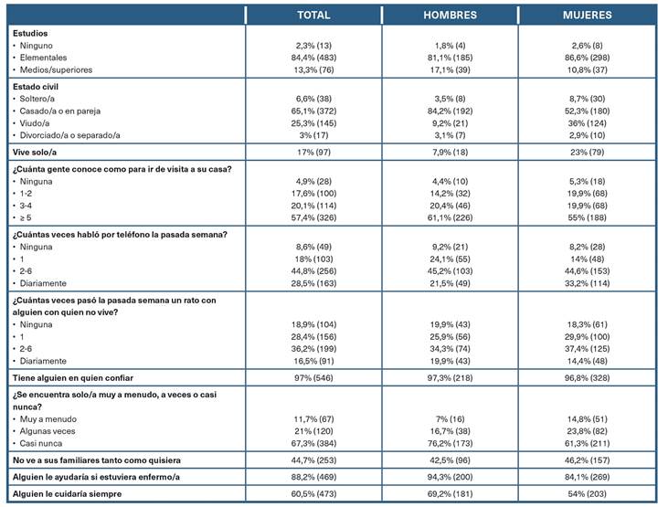 Se han entrevistado a 572 personas mayores de 65 años en la ciudad de Ourense seleccionadas aleatoriamente. Son mujeres el 60,1% (intervalo de confianza [IC] 95%: 56,0-64,2) con una edad media de 79 años (DE: 6,79), siendo mayores de 85 años el 20,1% (IC 95%: 16,7-23,4%). El 42,5% (IC 95%: 38,3-46,5%) se encontraba solo o sola para hacer la entrevista. La tabla 1 muestra las características sociodemográficas y los recursos sociales de la población analizada.