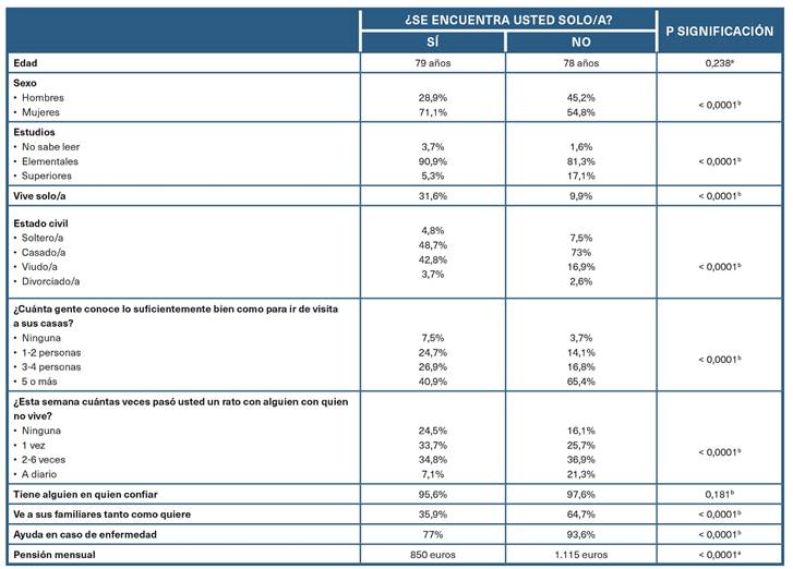 Se observaron diferencias significativas (p < 0,0001) entre quienes manifestaron soledad y quienes no respecto al sexo (ser mujer), y se observó menor nivel de estudios, vivir sola/solo, viudez o divorciados entre quienes tienen un círculo social más estrecho y una pensión más baja, como refleja la tabla 2.