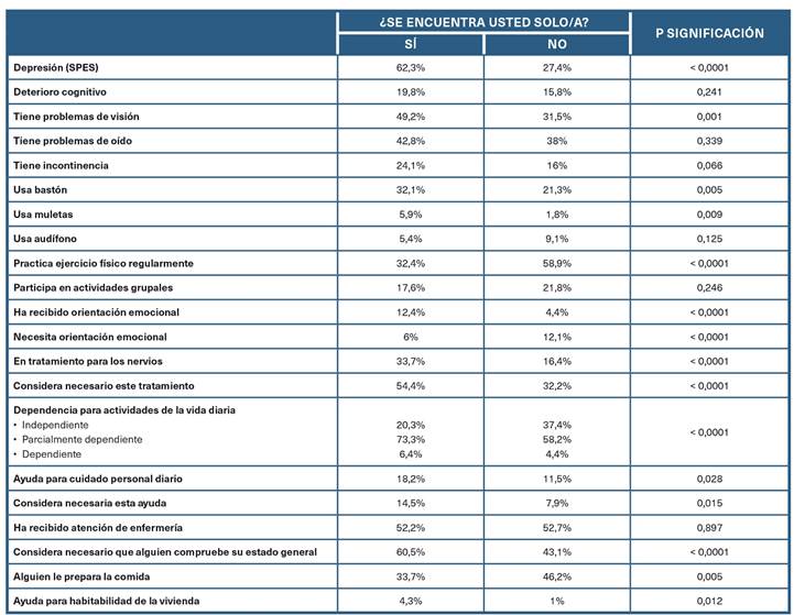 Methods: descriptive cross-sectional study, random sample of people aged over 65 interviewed between June 2010 and June 2011. Sample size was 486 patients (estimated loneliness 35%). The OARS (Olders American Resource and Services Multidimensional Functional Assessment Questionnaire) scale was administrated. This includes sociodemo-graphic variables, socio-economic resources, physical and mental health and the ability to undergo BADL and IADL. The question “are you alone?” with four possible answers was also posed.