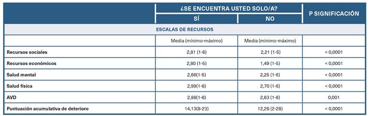 Al observar las escalas de recursos sociales, económicos, salud mental, salud física y dependencia, vemos que a peor puntuación en estos aspectos más soledad sufren las personas, siendo significativa en todos ellos (p < 0,0001), como reflejamos en la tabla 4.