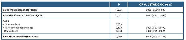 Al realizar el análisis multivariante, encontramos que la probabilidad del sentimiento de soledad se incrementa de forma significativa 3,4 veces en las personas que tienen depresión, 2 veces en las que no llevan a cabo regularmente alguna actividad física, 1,6 veces en las que son dependientes para las AVD y 2,1 veces en las que reciben tratamiento por problemas familiares o personales, nerviosos o emocionales en los últimos 6 meses (tabla 5).