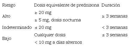 El problema clínico fundamental que se plantea en el paciente en tratamiento crónico con GC es el riesgo de aparición de IS tras la retirada del tratamiento. Sin embargo, la IS puede estar presente incluso en el paciente que se encuentra con una mínima dosis eficaz de GC3-4. Entre los factores que pueden determinar el riesgo de aparición de IS secundaria a GC, están la dosis total acumulada y la duración del tratamiento5. En una revisión sistemática, el uso de GC durante un mes se asoció a una prevalencia de IS de 1,4%, siendo de hasta el 27,4% en tratamientos de duración superior a 1 año. El tratamiento con GC a dosis medias y a largo plazo (durante más de 1 año) se asocia con la presencia de IS hasta en el 56,4% de los casos5. Sin embargo, no hay ningún límite ni en dosis acumulada ni en tiempo de tratamiento que sean predictores de la aparición de IS5.