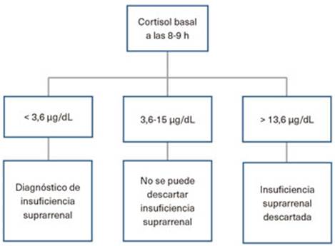 Muchos de los pacientes que presentan IS tienen clínica inespecífica. La aparición de síntomas típicos de IS como hiponatremia, hipotensión, hipoglucemia y debilidad generalizada son muy inespecíficos y no ayudan a identificar al paciente con IS, lo que se traduce en múltiples consultas a Atención Primaria7. La determinación de cortisol basal, entre las 8:00-9:00 h de la mañana sigue siendo el test de detección habitual de la IS6. Un cortisol basal < 3,6 µg/dL confirma la presencia de IS y no implica la realización de test adicionales6. Un cortisol < 5 µg/dL también es muy sugerente de IS. Si el cortisol es >15 µg/dL, se descarta la presencia de IS en la mayoría de los casos, aunque un cortisol >18 es más específico y descarta con total probabilidad la IS6. Un valor de 10-15 µg/dL es muy sugestivo de normalidad del eje hipofisario-adrenal, pero habrá pacientes con estos valores que presentarán IS6. En el paciente en tratamiento con GC se han objetivado valores similares de cortisol diagnósticos de IS7. Un cortisol basal > 13,6 µg/dL tiene una alta especificidad (95%) para determinar suficiencia del eje hipofisario-adrenal. Un valor de cortisol > 8,5 µg/dL ha mostrado alta sensibilidad (84%) con menor especificidad (71%)8. En la figura 1 se presenta un algoritmo de diagnóstico de la IS.