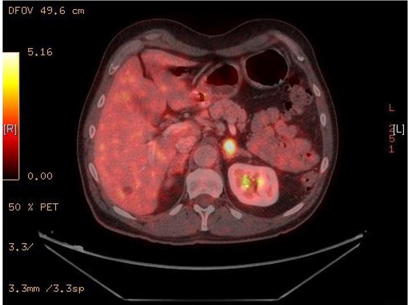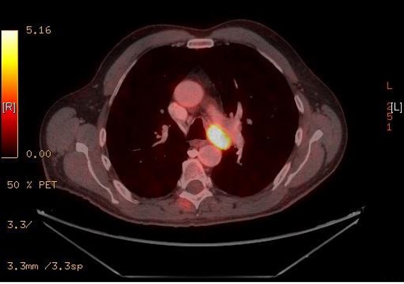 Presentamos el caso de un hombre de 60 años con múltiples antecedentes cardiológicos (fibrilación auricular paroxística, cardiopatía hipertensiva, aneurisma de aorta y angina de esfuerzo) que acude a consulta de seguimiento por cardiología y refiere debilidad progresiva de predominio proximal en miembros inferiores de 3 meses de evolución. Previamente había consultado por el mismo motivo a su médico de Atención Primaria y en dos ocasiones en el servicio de urgencias, habiendo interpretado los síntomas en el contexto de astenia de origen multifactorial. Como parte del estudio cardiovascular, se realiza una angiotomografía computarizada (angio-TC) de arterias coronarias donde se identifica, como hallazgo incidental, un nódulo pulmonar LII (CAD-RADs1) que histológicamente se corresponde con un carcinoma de pulmón de células pequeñas. En el estudio de extensión se identifican adenopatías y una metástasis suprarrenal izquierda (cTxN2M1b) (figuras 1 y 2).