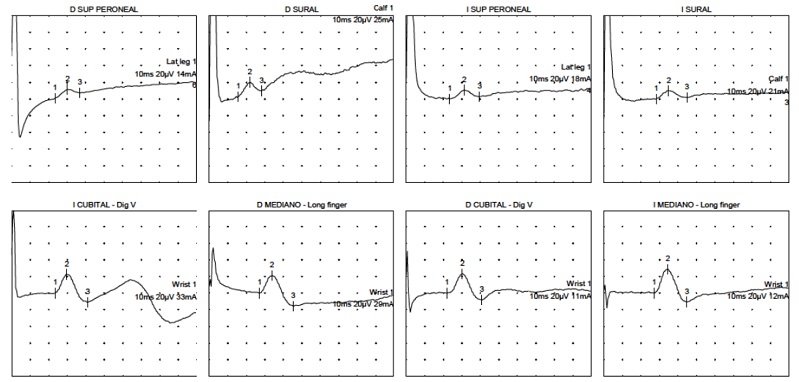 En cuanto a la debilidad de miembros inferiores, el paciente describe que empeora al subir escalones y conforme avanza el día. Es indolora y no se asocia a claudicación ni a déficits neurológicos focales. Se realiza eco-Doppler, que corrobora una adecuada perfusión vascular, y se solicita estudio electromiográfico (EMG), que no resulta concluyente (figura 3). Finalmente, en el estudio de autoinmunidad los anticuerpos anticanales de calcio voltaje dependientes resultan positivos.