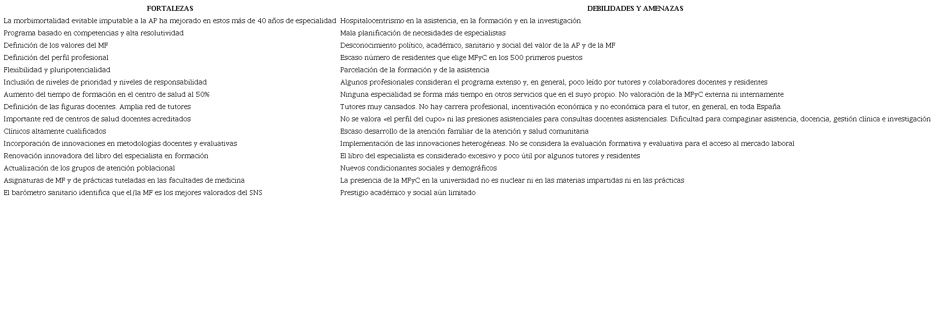 Los 17 años transcurridos con el programa de 2005, aún vigente, y las experiencias acumuladas nos permiten juzgar tanto sus fortalezas como sus debilidades (tabla 1) e identificar áreas de mejora en unas capacidades que no hemos logrado desarrollar y que tienen que ver con nuestros dos apellidos, «familiar y comunitaria», y con el «método clínico centrado en el paciente» (MCCP)10,11.