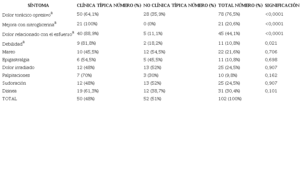 La tabla 2 muestra la frecuencia de presentación de los distintos síntomas relacionados con el SCA y si estaban presentes en las mujeres que se clasificaban con la clínica típica o no. Tenían dolor torácico 78 mujeres (76,5%), de las cuales un 64,1% presentaban clínica típica respecto al 35,9% de las que no (p <0,0001) (IC 95%: 68,24-84,70). Todas las mujeres con clínica típica tuvieron dolor torácico opresivo.