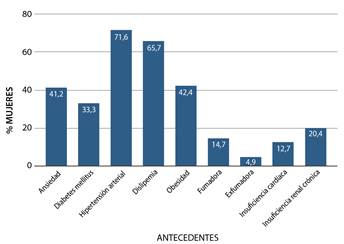 Además, se registraron los antecedentes de las pacientes incluidas en el estudio: edad, país de origen, antecedentes familiares de cardiopatía isquémica (sí/no), ansiedad o depresión (sí/no), diabetes mellitus tipo II (sí/no), hipertensión (sí/no), dislipemia (sí/no), obesidad [sí (si índice de masa corporal -IMC- >30 en el último registro)/no o no registro], hábito tabáquico (fumadora/exfumadora/no fumadora), insuficiencia cardíaca previa (sí/no), insuficiencia renal crónica [1) filtración glomerular [FG] ≥ a 60 mL/minuto/1,73 m2 (estadio I y II de la IRC), 2) FG 15-59 mL/minuto/1,73 m2 (estadio III-IV). 3) FG < 15 mL/minuto/1,73 m2 (estadio V o fallo renal)].