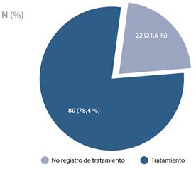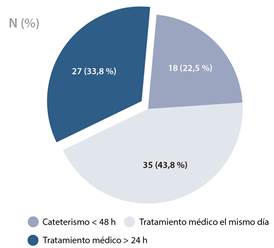 En 22 pacientes (21,6%) no hubo registro en la historia clínica del tratamiento realizado (figura 2). De entre las 80 (78,4%) pacientes que sí había registro de tratamiento, en 53 (66,3%) no hubo retraso terapéutico, 35 (43,8%) recibieron tratamiento médico el mismo día de aparición de la clínica y en 18 (22,5%) se realizó cateterismo en las primeras 48 horas (figura 3). No hay diferencias significativas en relación con el inicio de tratamiento según la edad.
