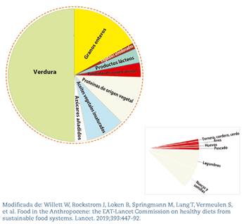 Siguiendo el modelo del plato saludable de Harvard, un plato de salud planetaria (figura 4) estaría formado por aproximadamente la mitad del plato de verduras y frutas y la otra mitad de granos enteros, fuentes de proteínas vegetales, aceites vegetales insaturados y (opcionalmente) cantidades modestas de proteínas de origen animal80, donde los alimentos se compran en el mercado local, según disponibilidad y temporada, sin productos envasados ni ultraprocesados y sin plásticos1.
