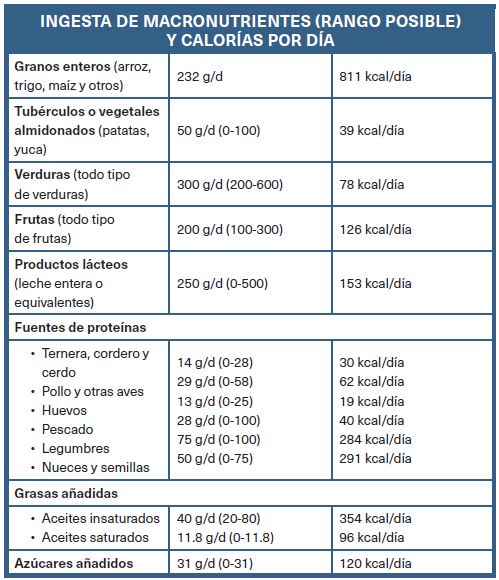 La dieta planetaria saludable tiene una ingesta calórica óptima y principalmente está compuesta por alimentos de origen vegetal, bajas cantidades de alimentos de origen animal, grasas insaturadas en lugar de saturadas, y cantidades limitadas de granos refinados, alimentos altamente procesados y azúcares añadidos. La dieta planetaria proporciona grupos de alimentos que combinados mejorarían la salud humana y la sostenibilidad ambiental (tabla 3); es necesaria una interpretación local que refleje la cultura y geografía de la población80, en la que, además de darle importancia al valor nutricional del alimento, se tendrá en cuenta su origen, forma de producción, ausencia de tóxicos, transporte y distancias recorridas, residuos generados, envasado, coste social y medioambiental1.