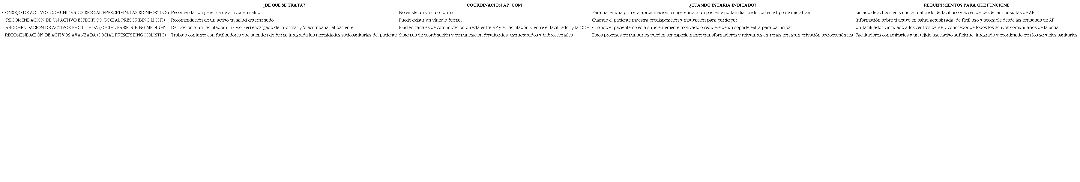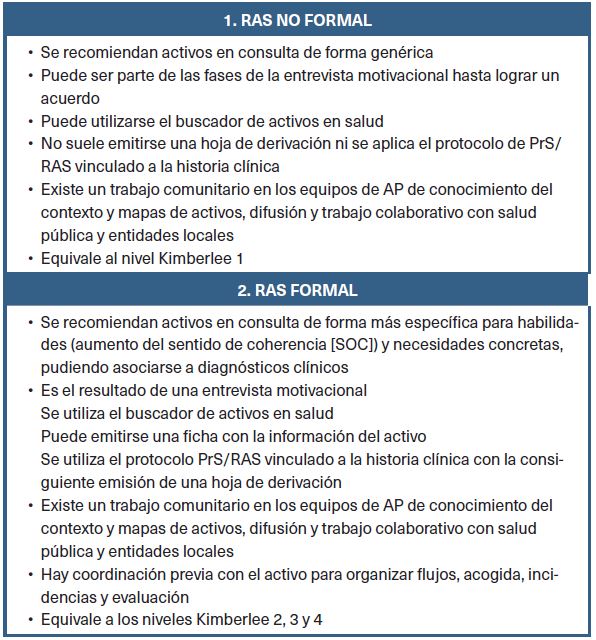 En España se dan pequeñas variaciones sobre esta clasificación. Por ejemplo, La guía de recomendación de activos para la salud en AP de Aragón5 agrupa los niveles anteriores en RAS no formal (1 Kimberlee) y RAS formal (2, 3 y 4), atendiendo al grado de estructuración y coordinación con los recursos comunitarios y teniendo en cuenta el papel clave de trabajo social (tabla 2).
