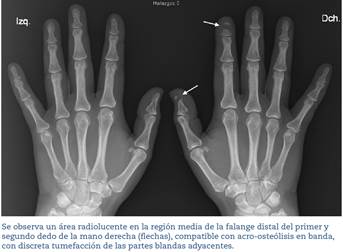 En la radiografía simple de ambas manos (figura 1) se visualiza una reabsorción ósea parcial en banda de la región media de la falange distal del primer y el segundo dedo de la mano derecha compatible con acro-osteólisis.