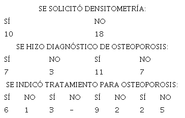 Los resultados previos a la self-audit se describen en la tabla 1. Se pudo comprobar que se había solicitado una DEXA al 35% (n = 10). De estos, se diagnosticó de osteoporosis al 70% (n = 7) y se trató al 90% (n = 9). Por otro lado, se evidenció que no se había solicitado DEXA en el 64% de los casos (n = 18). De estos, se diagnosticó y se trató de osteoporosis al 61% (n = 11).