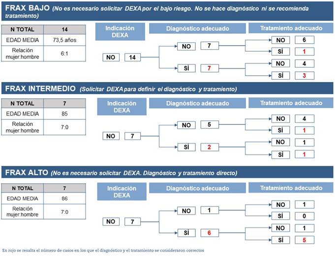 Como resultados de la self-audit(figura 1), podemos decir que 14 casos presentaban FRAX bajo (50%), al revisar su historia clínica (HC) se encontró que a 6 se les había solicitado DEXA y que a 10 se les indicó tratamiento para la osteoporosis. De los 7 casos con FRAX intermedio (25%), al revisar su HC, se encontró que a 3 no se les hizo DEXA, pero se trató a 4 pacientes. Y de los 7 pacientes que presentaban FRAX alto (25%), al revisar su HC, se observó que no se había solicitado DEXA para ninguno de ellos. En este escenario podemos decir que se diagnosticó adecuadamente al 53% de los casos (n = 15) y se indicó el tratamiento apropiado al 39% (n = 11).