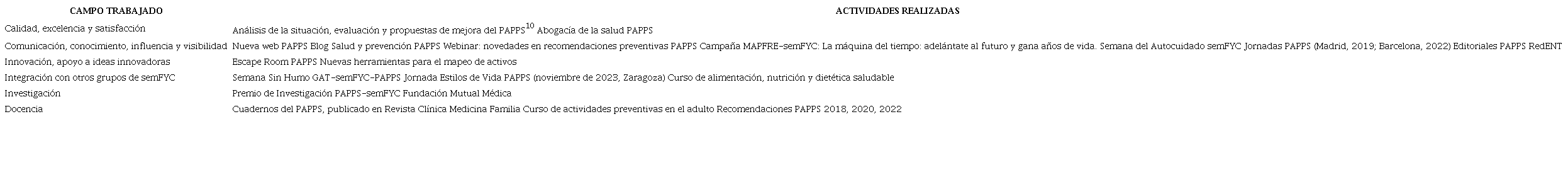 En estos años hemos trabajado en el PAPPS temas imprescindibles en toda organización sanitaria: la calidad, la comunicación, la innovación, la integración, la investigación y la docencia. En la tabla 1 se mencionan las principales actividades realizadas en cada área. Para el futuro del PAPPS necesitamos trabajar en las mismas líneas y, sobre todo, os necesitamos a vosotros, las y los profesionales de la sanidad que creéis en el valor de la prevención, para seguir avanzando con paso firme en prevención y promoción de la salud.