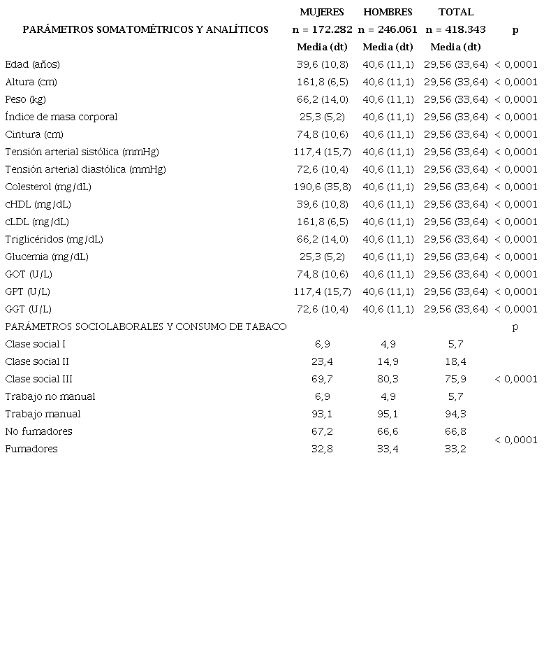 Las medidas antropométricas de talla y peso, clínicas y analíticas, fueron realizadas por el personal sanitario de las diferentes unidades de salud laboral participantes en el estudio, previa homogeneización de las técnicas de medición.