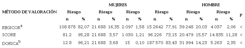Los valores de RCV alto/muy alto son siempre mayores en los hombres que en las mujeres (p < 0,0001). El RCV más alto en las mujeres se obtiene con REGICOR (1,58% de la población de mujeres) y en los hombres con SCORE (11,28% de la población de hombres) (tabla 2).