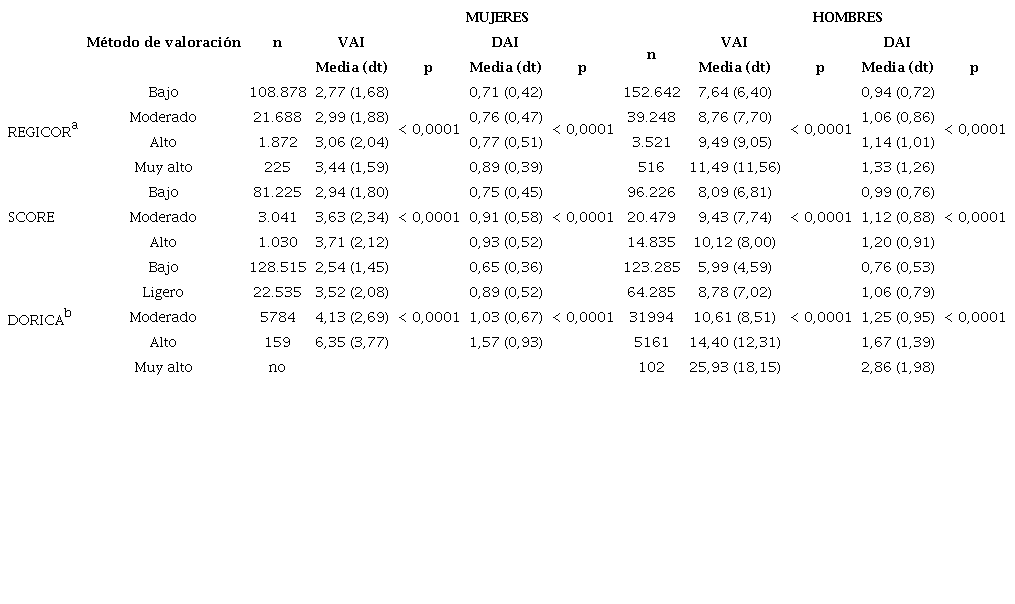 En ambos sexos, y con los tres métodos de valoración de RCV, los valores medios de VAI y DAI van aumentando según lo hace el RCV. Los valores medios más elevados de VAI se obtienen con el método DORICA, tanto en hombres (riesgo muy alto: 25,93 [desviación típica - dt -: 18,15]) como en mujeres (riesgo alto: 6,35 [dt 3,77]). Lo mismo ocurre con DAI; los valores más elevados se obtienen con DORICA en hombres (riesgo muy alto: 2,86 [dt 1,98]) y en mujeres (riesgo alto: 1,57 [dt 0,93]) (tabla 3).