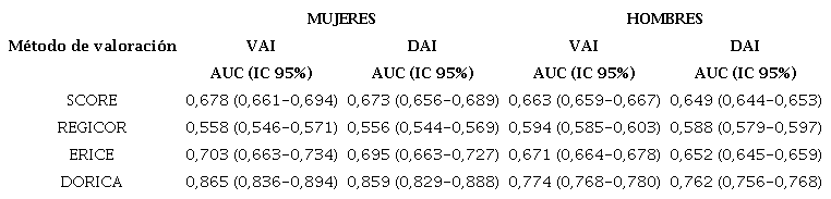 Resultados: los valores de RCV con los tres métodos son más elevados en hombres (p < 0,0001). El RCV más alto en mujeres se obtiene con REGICOR (1,58%) y en hombres con Score (11,28%). Con los métodos de valoración de RCV utilizados en ambos sexos, los valores medios de VAI y DAI van aumentando según lo hace el RCV. VAI y DAI son estimadores útiles de RCV en mujeres con DORICA AUC (área bajo la curva)-VAI 0,865 (intervalo de confianza [IC] 95%: 0,836-0,894) y AUC-DAI 0,859 (IC 95%: 0,829-0,888). En hombres, solo muestran moderada capacidad predictiva (valores AUC-VAI 0,774 (IC 95%: 0,768-0,780), AUC-DAI 0,762 (IC 95%: 0,756-0,768). La fortaleza asociativa es baja en ambos sexos con Score y REGICOR (AUC < 0,7).