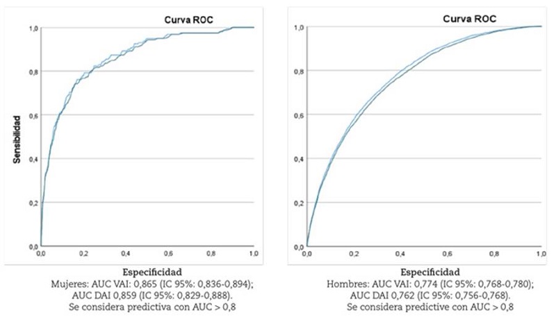 El VAI y el DAI muestran alta capacidad predictiva de RCV en mujeres con DORICA (valores AUC > 0,8) y moderada en hombres (AUC > 0,7-< 0,8). En ambos sexos, el VAI y el DAI muestran valores con baja capacidad predictiva en RCV estimado con SCORE y REGICOR (AUC < 0,7).