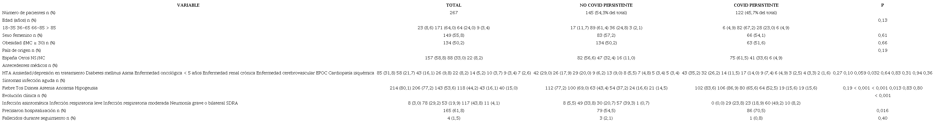 La edad media fue de 57 años (DE: 16,0) y 149 pacientes (55,8%) fueron mujeres. El 25,1% fueron profesionales de la salud20. Los trastornos más comunes en su historia clínica previa fueron obesidad (50,2%), hipertensión arterial (31,8%) y trastornos neuropsiquiátricos en tratamiento farmacológico (21,7%). Los síntomas más comunes en las primeras 4 semanas de la infección COVID fueron fiebre (80,1%), tos (77,2%), disnea (53,6%) y astenia (44,2%). En este período, el 61,8% de los pacientes requirió atención hospitalaria y el 43,8% sufrió neumonía bilateral. La tabla 1 muestra las características sociodemográficas de los pacientes, antecedentes médicos previos, síntomas y evolución clínica en la fase aguda.