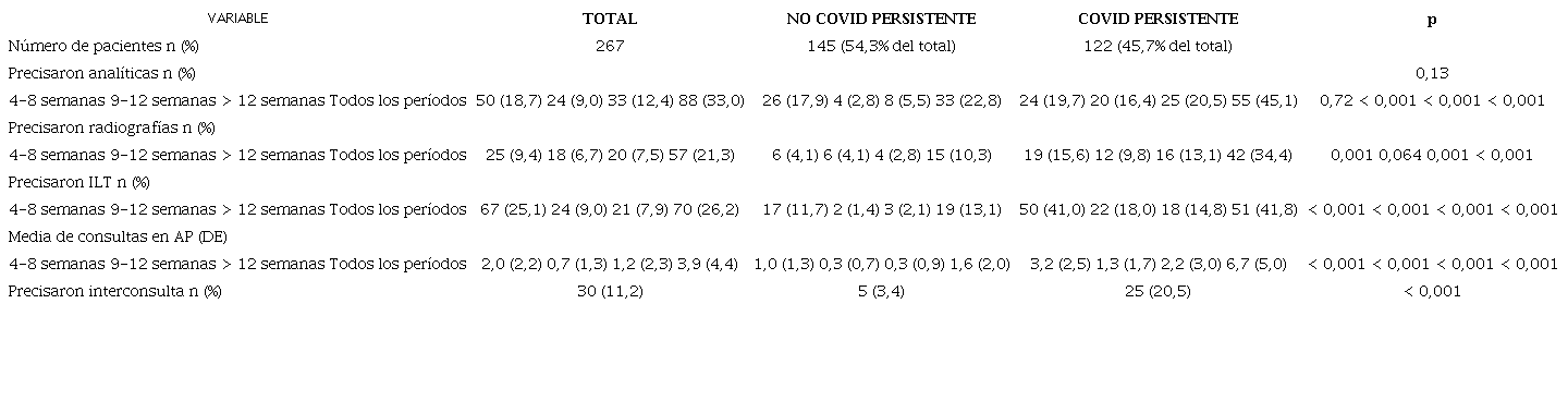 Por otro lado, en los pacientes con COVID persistente, el 98,4% requirieron al menos una consulta en su centro de AP en el mismo período, con un promedio de 6,7 (DE: 5,0) consultas. Al menos al 45,1% se le hizo una prueba de laboratorio, y al 34,4%, una radiografía de tórax. El 20,5% necesitó una derivación a un especialista hospitalario y el 41,8% requirió una baja laboral durante el seguimiento (representando el 72,9% del total de pacientes de la muestra que precisaron una baja laboral).