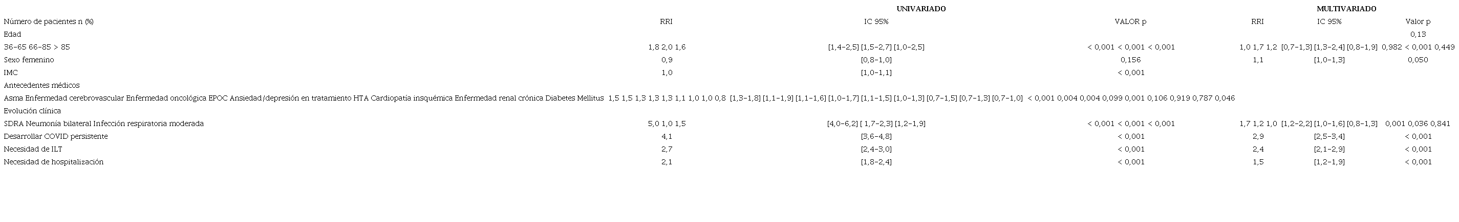 En nuestro estudio, los principales factores asociados con un mayor número de consultas en AP fueron tener COVID persistente (RRI: 2,9; IC 95%: 2,5-3,4), requerir una ILT (RRI: 2,4; IC 95%: 2,1-2,9), tener entre 66 y 85 años de edad (RRI: 1,7; IC 95%: 1,3-2,4), desarrollar SDRA (RRI: 1,7; IC 95%: 1,2-2,2), necesitar hospitalización (RRI: 1,5; IC 95%: 1,2-1,9) y desarrollar neumonía bilateral (RRI: 1,2; IC 95%: 1,0-1,6).