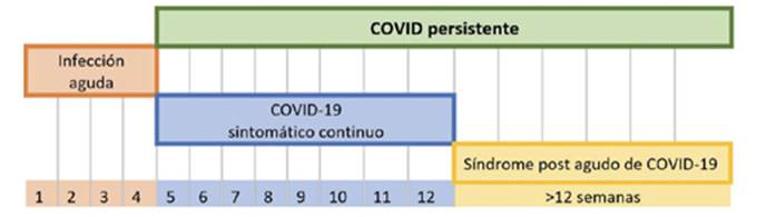 Recientemente, se ha desarrollado una definición para describir el síndrome postagudo de COVID-1910. Es una condición que ocurre en individuos con antecedentes de infección por COVID-19, generalmente 3 meses después del inicio de la enfermedad, con síntomas que duran al menos 2 meses y que no se explican por un diagnóstico alternativo. Estos síntomas a menudo se superponen, fluctúan y reaparecen con el tiempo.